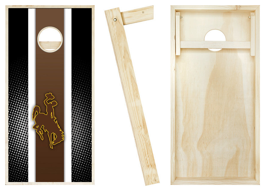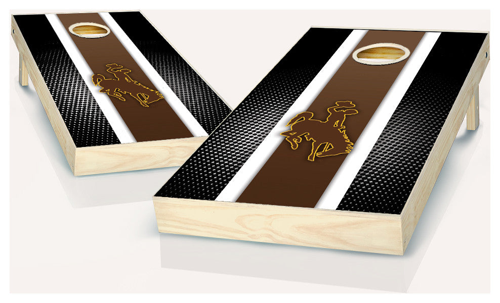 Officially Licensed Wyoming Cornhole Set. Show off your Cowboy pride at your next cookout or tailgate with our signature striped design. Cornhole Set comes ready to play right out of the box, no assembly required! Set comes complete with 2 wooden game boards and 8 officially licensed Wyoming bags! Officially Licensed Collegiate ProductRegulation Size (2 Feet x 4 Feet)Tournament Grade ConstructionFolding Legs For Easy StorageAll Wood Construction Set Includes 8 Bags. All sets are made using a premium 2x4 frame and 1/2" sanded plywood playing surface. Each set has folding 2x4 legs secured with galvanized bolts.