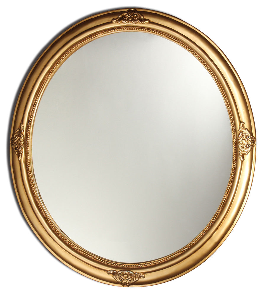 This oval shaped mirror features an antique gold finish that will complement many decors throughout your home. This piece can be used on a wall or as part of a table centerpiece, creating a stylish atmosphere wherever it is on display.