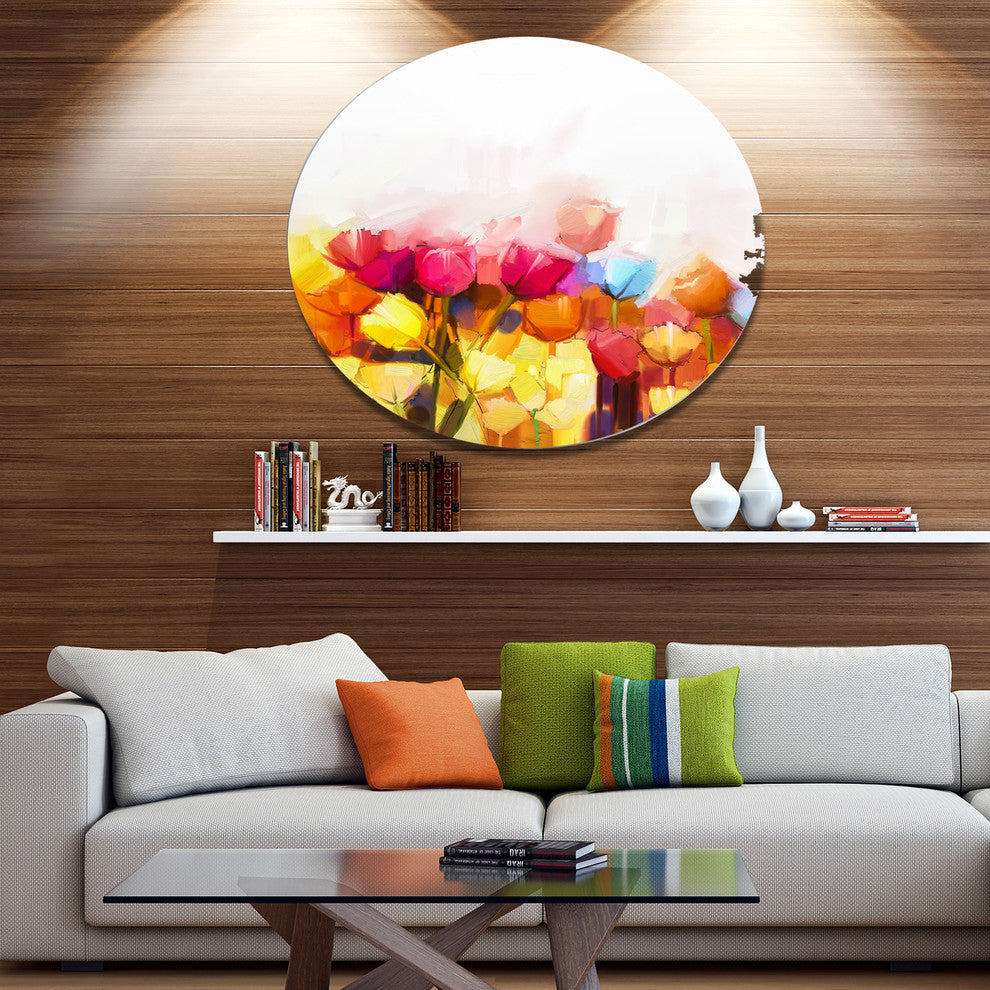 Bring Contemporary Abstraction to your home with this large Circle Metal wall art. This Yellow Pink Red Tulips on White Metal Artwork makes it the focal point of any room or office.