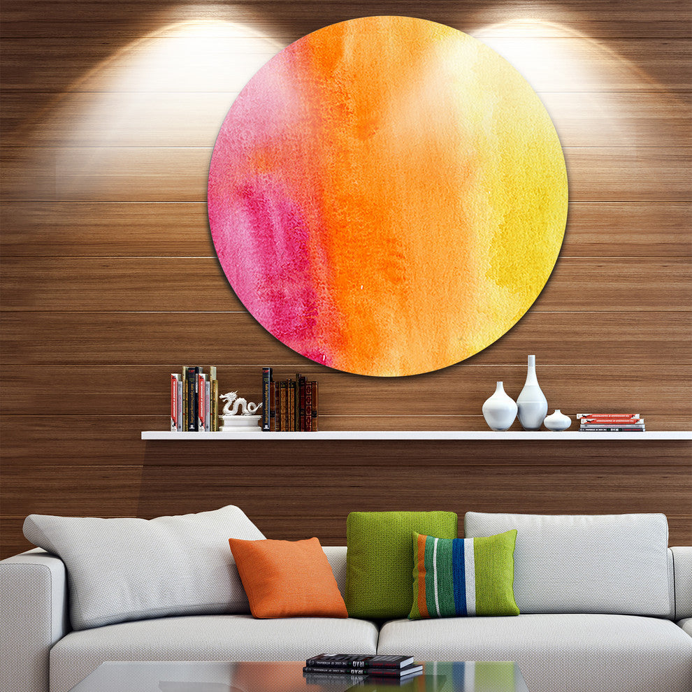 Bring Contemporary Abstraction to your home with this large Circle Metal wall art. This Yellow, Purple Meet Orange Metal Artwork makes it the focal point of any room or office.