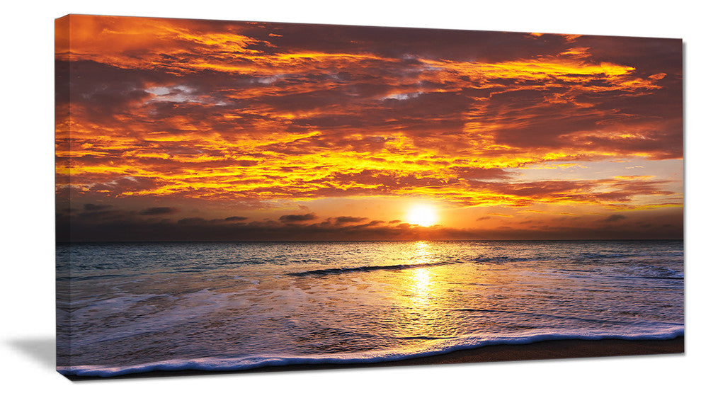The Yellow Sunset above Foaming Waves canvas art print is sure to make an impression on anyone who sees it. This artwork is gallery wrapped around a 1-inch solid wood frame and arrives carefully packaged and entirely ready to hang on the wall. Design Art only uses the highest resolution and pigments to ensure a crisp colorful print that is never faded or pixelated. This artwork is sure to be a conversation starter in any home or office.