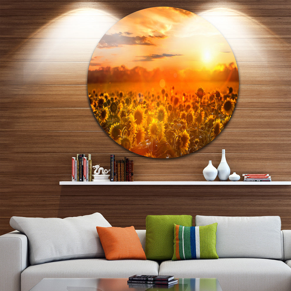 Bring Contemporary Abstraction to your home with this large Circle Metal wall art. This Yellow Sunset over Sunflowers Metal Artwork makes it the focal point of any room or office.
