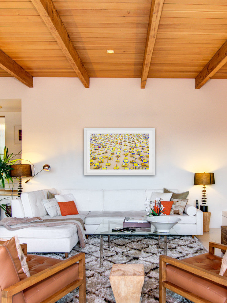"Yellow Umbrellas" Framed Painting Print features vivid tones and supple artistry. Mounted in a gorgeous frame, this 45 inch wide by 30 inch tall piece will be an exceptional addition to any room. Top quality Giclee print on high resolution Archive Paper Professionally framed and mounted on acid free archive matte High quality durable non-warping frame Arrives ready to hang Includes a certificate of authenticity Made in the USA