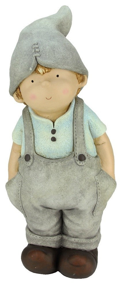 With spring right around the corner, this fun addition will add a pop of color to your gardenCrafty little gnome boy is dressed in gray overalls and a baby blue t-shirt and holding his hands in his pocketsFor indoor or outdoor useDimensions: 17.75"H x 7.5"W x 5.25"DMaterial(s): plaster