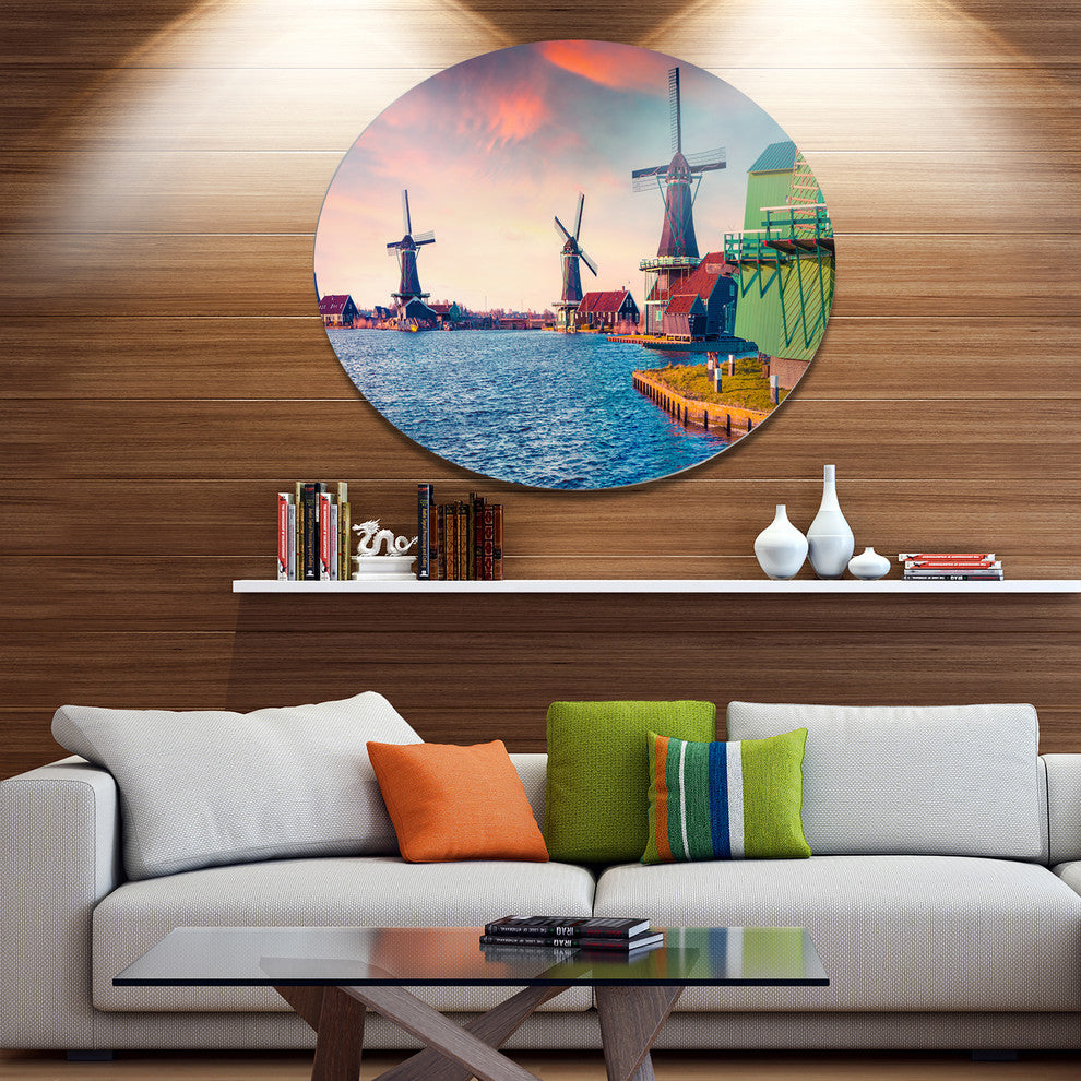 Zaandam Mills On Water Channel, Landscape Art Disc Metal Wall Art, 36"