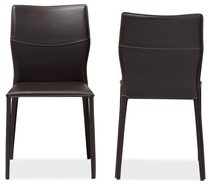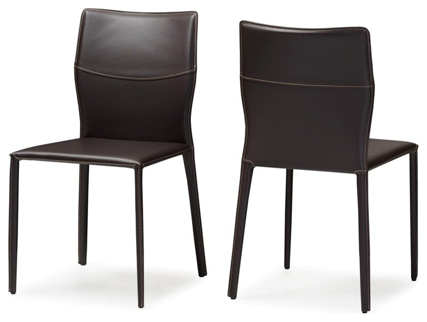Enhance your home decor with Zack Dining Chairs. Constructed of metal steel frame with recycled leather, the dining side chair set features slim legs and thick leather upholstery over a slightly curved back. The dining chair features stitched leather seat for sleek allure. Due to its firm and sturdiness, Zack dining chair can be used in residential and commercial setting. Features: Metal frame Recycled leather upholstery with matching stitching Thick leather over sturdy frame Available in: Black and Brown Dimensions: 34"H x 18.75"W x 22.25"D. Seat H - 18"