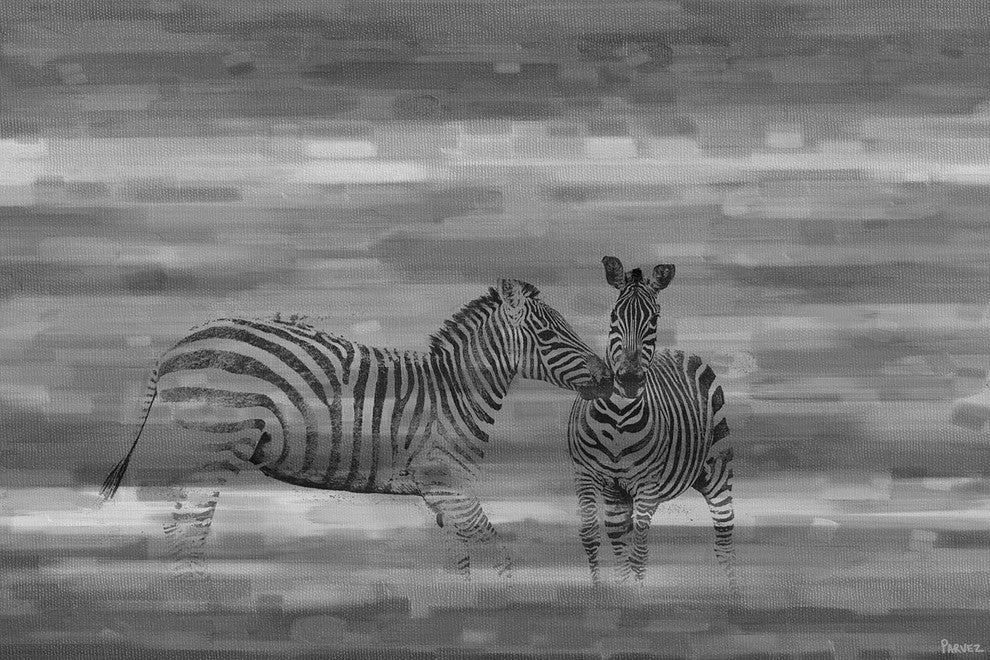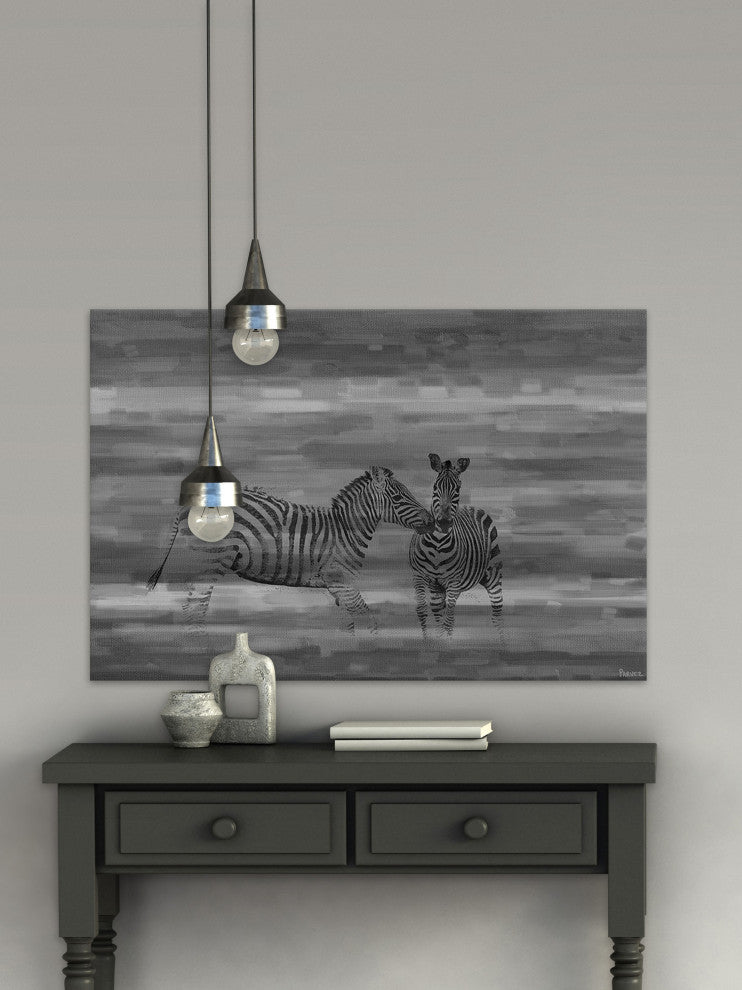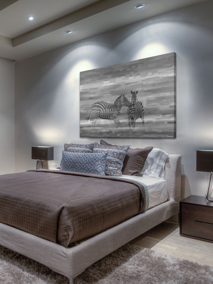Striking and unique, the "Zebra Romp" Print on Canvas by Parvez Taj will bring your walls to life. Printed on canvas, this 36 inch wide by 24 inch tall contemporary artwork will make a statement in any living room, dining room, or bedroom.- Fine art canvas print by Parvez Taj- Professionally hand stretched- Gallery wrapped in sustainable, non-warping wood- Arrives ready to hang- Made in the USA- Includes a certificate of authenticity- Artist signature on the front