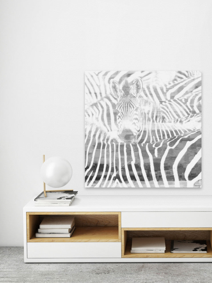 Striking and unique, the "Zebra Stare" Print on Canvas by Parvez Taj will bring your walls to life. Printed on canvas, this 24 inch wide by 24 inch tall contemporary artwork will make a statement in any living room, dining room, or bedroom.- Fine art canvas print by Parvez Taj- Professionally hand stretched- Gallery wrapped in sustainable, non-warping wood- Arrives ready to hang- Made in the USA- Includes a certificate of authenticity- Artist signature on the front