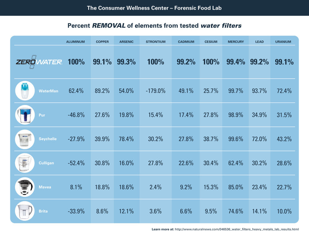 Enjoy great-tasting water with the latest filter technology. The ZeroWater® filtration system combines FIVE sophisticated technologies that work together to remove virtually all dissolved solids from your tap water, delivering you great tasting water. These are the only pour-through filters on the market certified by the NSF to reduce lead. ZeroWater®''s first layer of filtration, activated carbon and oxidation reduction alloy removes the chlorine taste you are accustom to with tap water. The Ion Exchange stage removes virtually all dissolved solids that may be left over from public water systems or even leached into your water from piping such as Aluminum, Lead, Zinc, Nitrate and more. Three additional stages are included to remove other impurities and to ensure your water receives the appropriate amount of treatment time to deliver a "000" reading on your laboratory-grade Total Dissolved Solids meter included. • Coarse filter to remove fine particles/ sediment• Uses activated carbon and oxidation reduction alloy• Uses non-woven membrane to remove fine particles• Only Filter Pitcher certified by NSF to reduce both lead and chromium• 5-Stage Filtration removes 99.6% of Dissolved Solids• Fits all ZeroWater® Pitchers and DispensersZeroWater®''s five stage process:• Stage 1: Coarse filter to remove fine particles/sediment.• Stage 2: Distributor that maximizes contact time.• Stage 3: Multi-layer system using activated carbon and oxidation reduction alloy.• Stage 4: Comprehensive ION EXCHANGE array.• Stage 5: Non-woven membrane to remove fine particles.