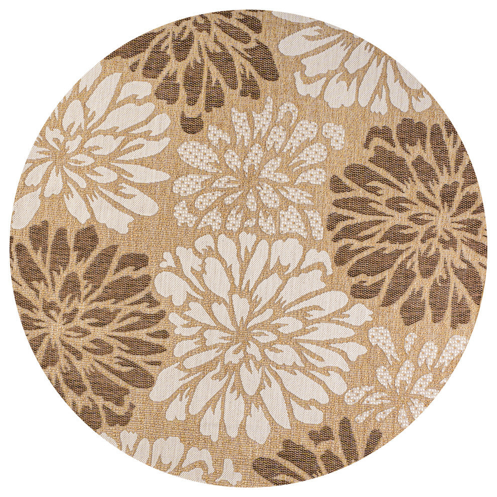 Add some graphic punch to your porch or patio with the bold blooms on our modern floral rug. The large-scale pattern has a geometric effect in a simple palette of soft cream, brown and beige. The flatweave design is great for high-traffic spaces indoors too.Features:• Flat-weave construction of 100% polypropylene• Brown and cream flowers on a taupe background• Water resistance with 0.19" pile• 100% Polypropylene• No backing, use of rug pad is recommended (sold separately)• Power Loomed in Turkiye• Actual Dimension: 7 ft 9 in. x 7 ft 9 in. Round• Color: Brown/Cream• Thickness measures: 0.19 in.• Available in multiple sizes and/or colorsRug Care:• Vacuum regularly and spot clean as needed; avoid direct and continuous exposure to sunlight; use brushless vacuum; remove spills immediately; if liquid, blot with clean, undyed cloth by pressing firmly around the spill to absorb as much as possible; for hard to remove stains, professional rug cleaning is recommended; store in a dry, well ventilated area and rotate for consistent wear• Packing and shipping may cause temporary creases in rugs, which will flatten out after a week on the floor; to expedite the process, try back-rolling your rug before laying it down, and then allow ample time for the remaining creases to relax• Please Note: Due to differences in monitors, some rug colors may vary slightly. Lengths and widths may vary from the published dimensions. Patterns may vary slightly according to shape and size selected.About us:Style your floors with JONATHAN Y. By combining fine craftsmanship and design, this New York creative studio is bringing fashion to your floors. The collection mixes sustainable organic materials, vibrant colors and trend worthy styles to create JONATHAN Y''s distinctive catalog of rugs.