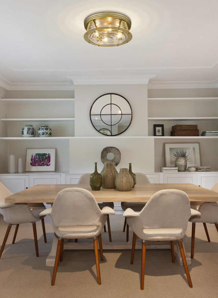 Inspired by the Fresnel lens used by historic lighthouses along the coastal shores of North America, Cape Harbor brings an authentic nautical feel with a fresh design twist. This versatile flush mount will seamlessly complement a variety of design trends from coastal to industrial. Available in Brushed Nickel, Bronze, Matte Black, Polished Nickel, Rubbed Brass finishes.Delivering bright lighting for a modern space, this brass and glass four-light flushmount ceiling light covers all design bases with a nautical-inspired motif serving industrial, modern, and Art Deco aesthetics. Emulating a Fresnel lens found in historic lighthouses on coastal North American shores, this light from the Cape Harbor collection blends chic ribbed glass with warm rubbed brass finish steel to create versatility and an expressive look in any contemporary or transitional space.Style : transitional, traditional, coastal, ClassicalBulbs Included : NoENERGY STAR : NoUL CLASSIFICATION : CUL/cETLuUL APPLICATION : DampActual Length/ext : 20"Frame Finish : Rubbed BrassFrame Material : SteelShade Finish/Color : ClearShade Material : GlassBulb Wattage : 60Number of Bulbs : 4Bulb Base : MediumDimmable (Yes/No) : YesActual Width : 20"Actual Height : 6.5" Canopy Dimensions : 20"L x 20"WActual Weight : 19 lbs